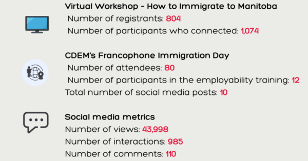 These two flagship events — the virtual workshop “How to Immigrate to Manitoba” and CDEM’s Francophone Immigration Day — highlighted diversity, inclusion, and the inspiring journeys of Francophone immigrants who contribute to Manitoba’s economic and cultural vitality.